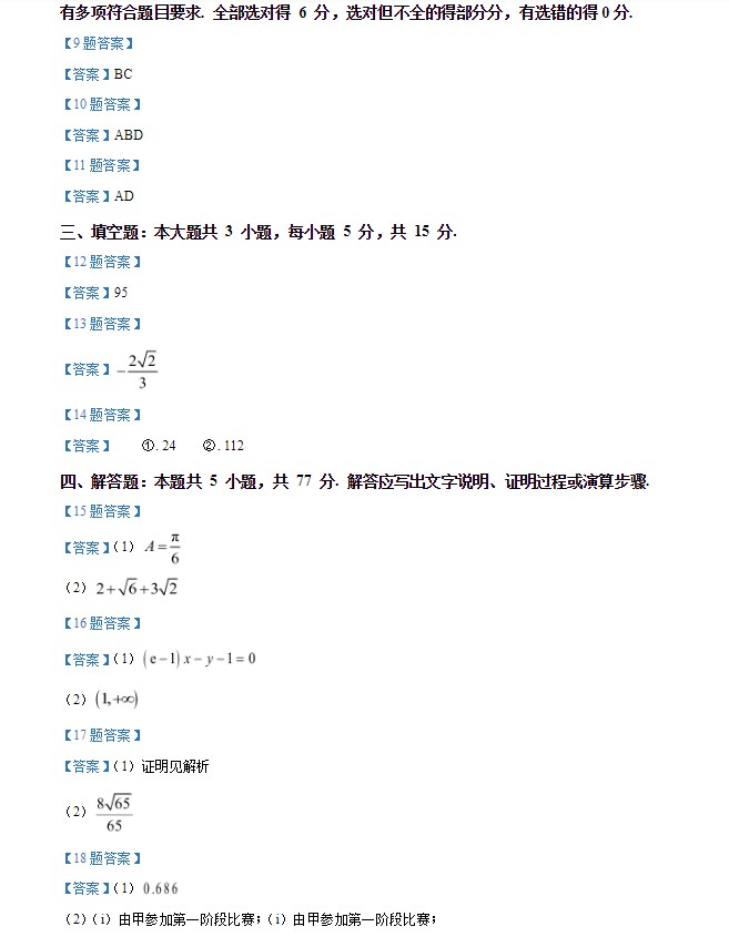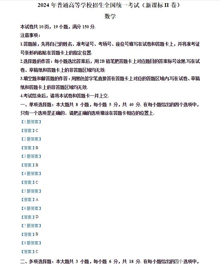 2024新高考全国二卷数学试卷及答案(图片版)-必威